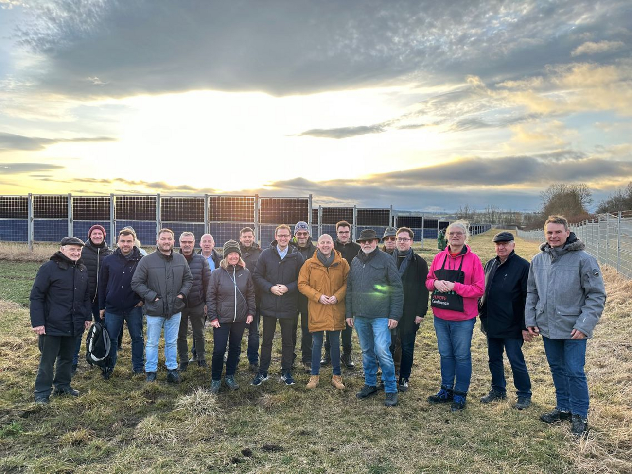 Anschließend besuchte die Teilnehmer, darunter zahlreiche Gemeinderäte aus dem Landkreis Böblingen, einen bifaziale Solarpark. Die senkrecht aufgestellten Photovoltaik-Module ermöglichen es, dass zwischen den Reihen eine landwirtschaftliche Nutzung des Bodens möglich ist.